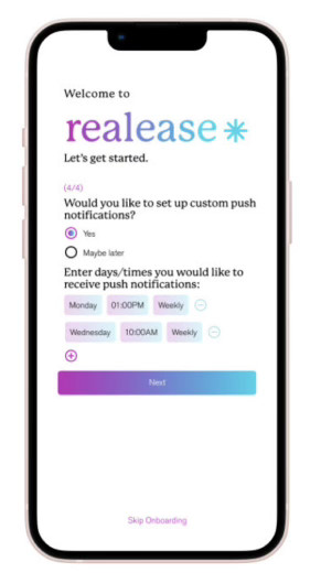 The main function of the app is the Fidget section. This page of the app will include a variety of activities that mimic sensory experiences in the way that physical fidget toys do.Each activity has haptic vibration responses that can be customized, along with subtle color changes to keep the user engaged in the activity.Each time a user begins an activity, the time they use it is tracked and reported in the Data dashboard. This allows users to monitor when and where they use the app most often, and helps to keep track of picking/pulling urges.The onboarding and profile sections of the app allow for the user to tailor the experience to their needs, by pulling recommended activities based on behavior modification desires. Users can also add custom notifications to remind themselves to use REALease instead of picking or pulling at peak urge times.