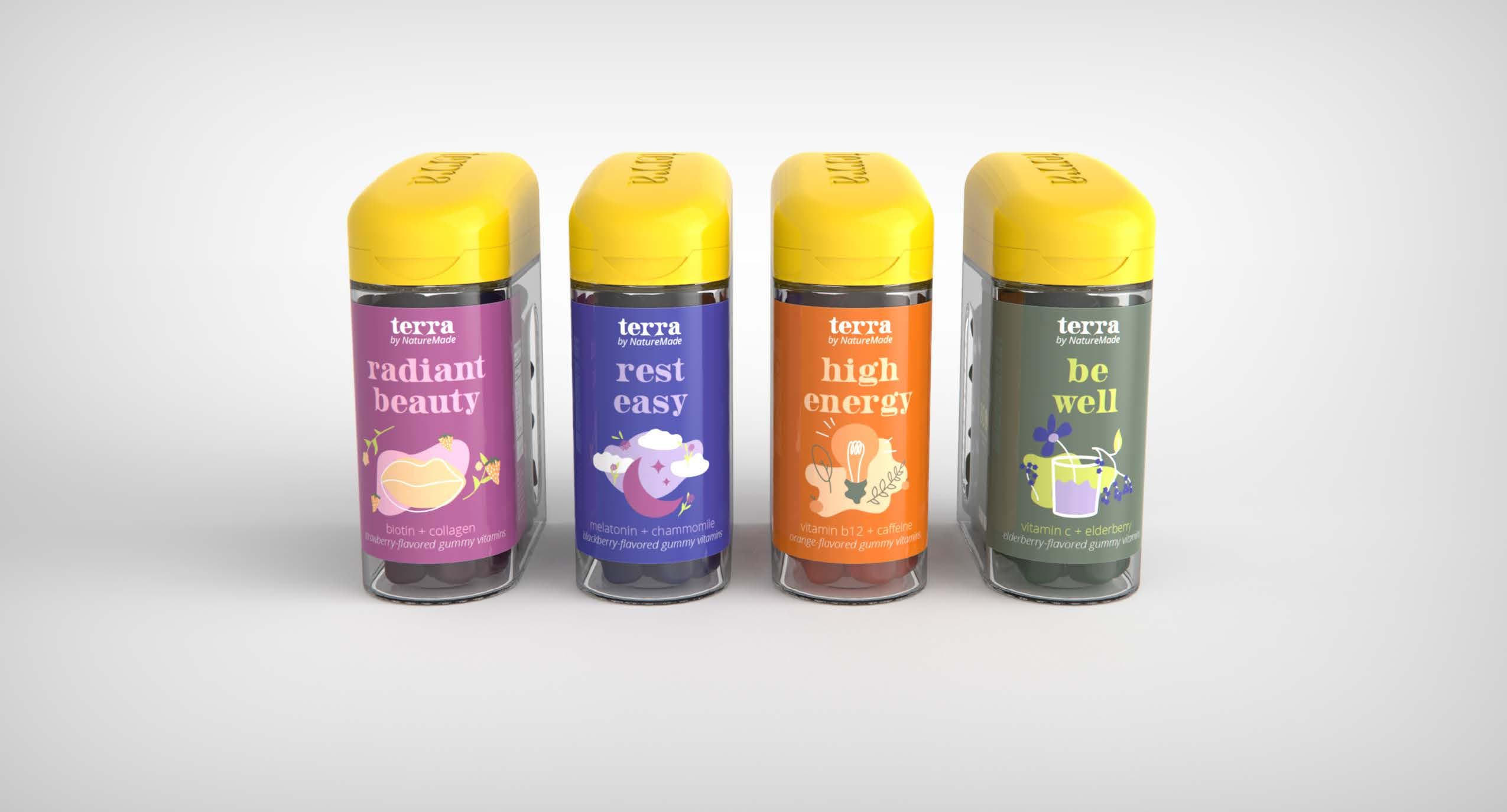 We also wanted to make a point to help improve the presence of the product on the shelf with competitor products. A tall, thin silhouette and the bright yellow cap help Terra to stand out from other multivitamins. The recognizable NatureMade cap provides trust in the product and the trendy brand colors attract a younger audience.